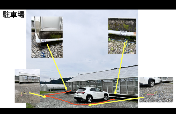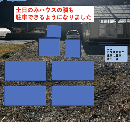 ビニールハウスの横になります 平日4台。土日祝日14台くらい駐めれます。